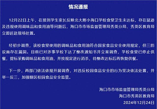 12月22日上午,在接到学生家长反映北大附小海口学校食堂卫生未达标,存在鼠迹及违规使用调味品和食用油等问题后,海口市市场监督管理局秀英分局、秀英区教育局立即赶赴现场处置。