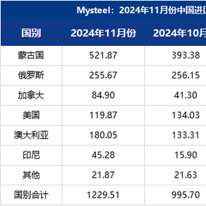 据海关总署最新数据显示,2024年11月份,中国进口炼焦煤总量1229.51万吨,环比上涨23.48%,同比上涨13.72%。整体来看,除俄罗斯以及美国,其余国家较10月份均上涨,涨幅较为明显的是加拿大和印尼,分别为105.59%,184.86%蒙古国,澳大利亚涨幅分别为32.66%,35.06%俄罗斯美国环比小幅下降,分别为0.19%,10.56%。分国别来看,澳大利亚炼焦煤方面,10月澳大利亚远期炼焦煤市场价格整体呈震荡下行趋势,但相较于国内焦煤,澳大利亚炼焦煤优势依存,进口量依旧上涨。蒙古国方面,10月份恰逢国庆假期,口岸闭关7天,通关天数减少,11月份正常通关,进口量小幅上涨。加拿大方面,10月份受铁路运输、工人罢工等问题影响,一定程度上影响了进口数量,11月份恢复正常,进口量较10月份上涨明显。印尼方面,基于中间环节及下游终端刚性需求,价格合适的情况下下游接货积极性上涨。从整体进口格局来看,蒙古国和俄罗斯炼焦煤仍是进口主力,两者合计进口777.54万吨,占11月进口炼焦煤总量的63.24%