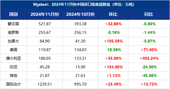 一、11月份进口炼焦煤进口炼焦煤总量1229.51万吨,环比上涨23.48%