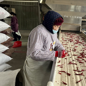 在中国辣椒城,工作人员进行辣椒捡分工作。