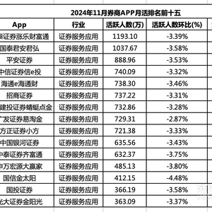 11月,股市行情进入震荡期,证券行业的活跃用户规模也出现了下滑。华泰证券涨乐财富通和国泰君安君弘的月活人数仍然在千万级别以上,分别为1193.1万人、1037.67万人,对应降幅分别为3.39%、3.58%。