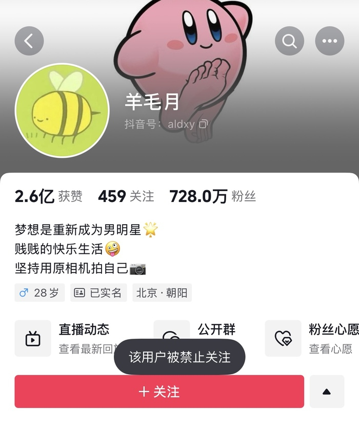 12月24日消息,网红博主“羊毛月”的抖音账号主页显示,该用户被禁止关注。