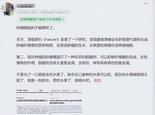今天微博一条关于“砂糖橘真的不能再吃了”的消息“炸”了,消息称,《自然》上有研究表明:果糖会促进肿瘤生长,而砂糖橘中含有大量果糖;并且现在种植的砂糖橘是打了脱酸剂增甜,这种物质是含有重金属的致毒性物质。这条消息发出后广泛传播,并引起了不少人对沙糖橘的恐慌。