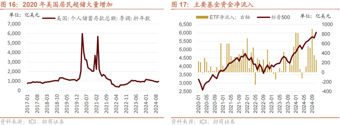 2020年后美联储采取大规模宽松政策,将利率降至接近零,并通过量化宽松向市场注入大量流动性,为资本市场提供了强有力的支撑。同时,疫情期间的财政刺激政策导致居民部门积累了大量超额储蓄,部分超额储蓄在还贷和消费后涌向资本市场。更为关键的是,宽松政策下美股的强劲反弹和持续上涨激发了显著的ETF赚钱效应,吸引更多资金通过ETF进入股市,形成了正向反馈。