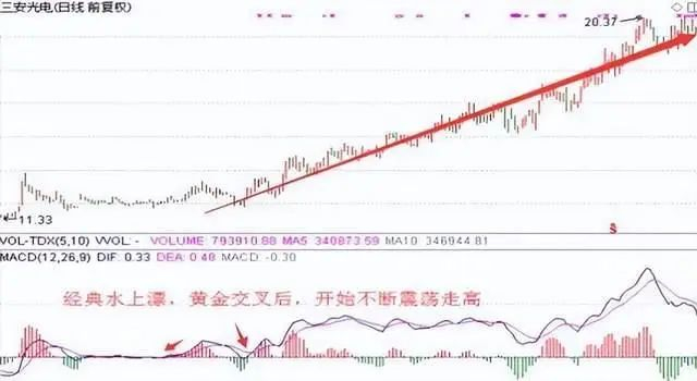 第三大特征:周MACD在零轴上方刚刚发生“黄金交叉”或即将发生“黄金交叉”,这就是MACD战法里著名的空中加油形态。