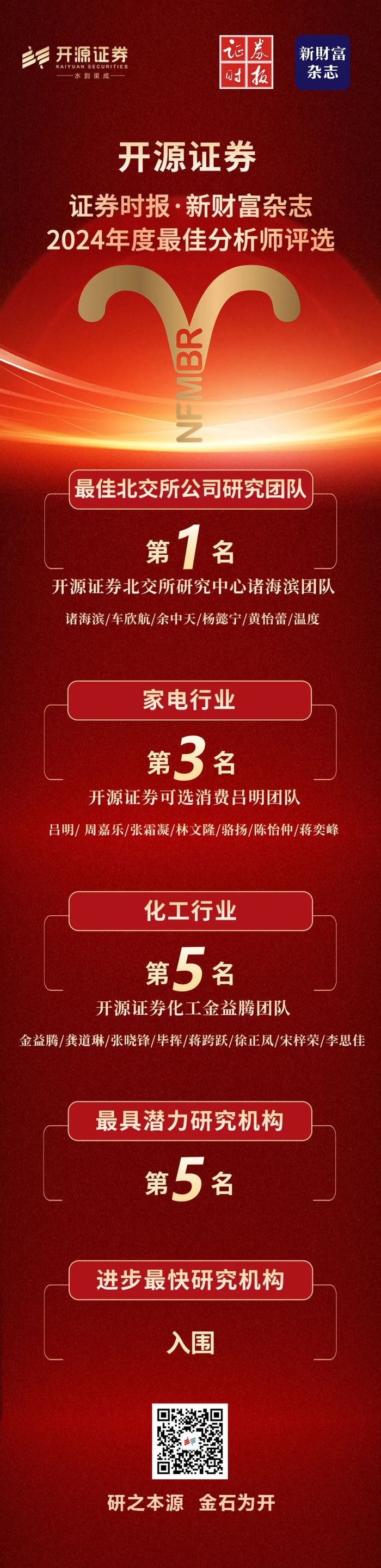 “开源研究”实力和品牌影响力受到多方认可,公募保险研究排名保持行业前15,近几年公募分仓佣金增速居行业前列。先后荣获证券时报·新财富杂志2024年度最佳分析师评选“最具潜力研究机构”、“最佳北交所公司研究团队第一名”;第十八/十九/二十一届新财富最佳分析师评选“最具潜力研究机构”;第十四/十五届卖方分析师水晶球奖“进步最快研究机构”;第二/三届上证报最佳分析师评选“进步最快奖”第一名、上证“最佳研究所所长”;中证金牛分析师评选“最具潜力研究机构”;21世纪金牌分析师评选“年度影响力券商研究所”、“最具潜力金牌研究团队”、“进步最快金牌研究团队”;第三/四/五/六届新浪财经金麒麟最佳分析师评选“最具特色研究机构”、“进步最快研究机构”、“菁英研究机构”;金融界领航中国第九届“中国杰出证券研究所”、第十届“慧眼·杰出研究所”、第十一/十二届金智奖“杰出证券研究机构”;第十/十一届中国证券金紫荆奖“最佳研究所所长”;第八/九/十/十一/十二届Wind金牌分析师评选“最受关注券商”、“最受欢迎机构”、“最佳北交所研究机构”;中国证券业最具特色研究君鼎奖、中国金鼎奖“最具潜力研究所”等奖项,连续多年上榜“IAMAC推介—“最具进取证券机构”、“最具潜力证券机构”,开源证券研究所多个行业上榜各大奖项评选。