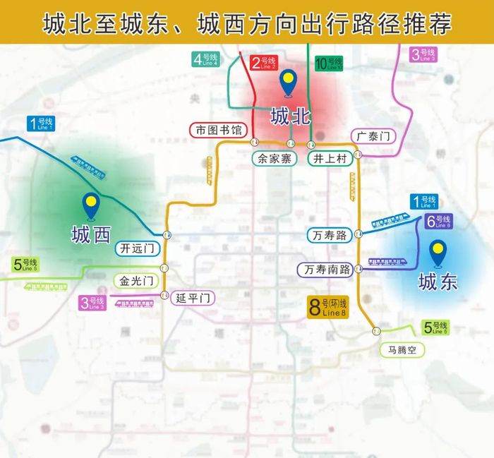 以前由城东方向经1号线北大街站、6号线钟楼站、5号线南稍门站换乘前往城南、城北方向的市民乘客,现在可选择在1号线万寿路站、6号线万寿南路站、5号线马腾空站换乘8号(环)线前往。