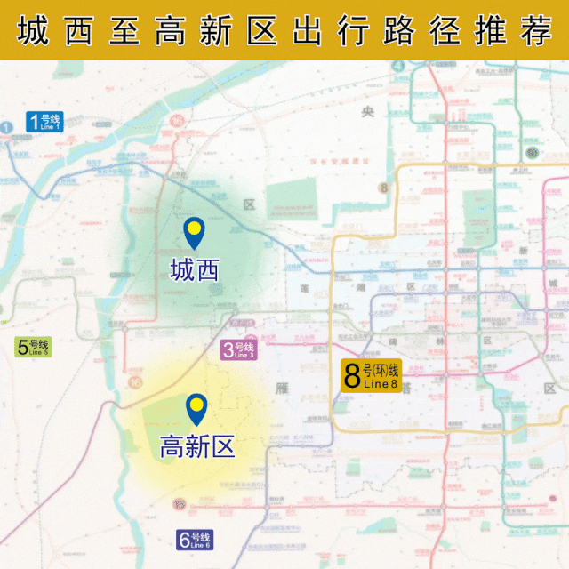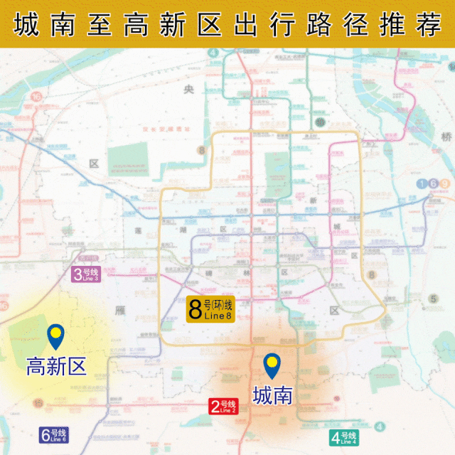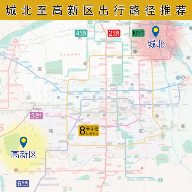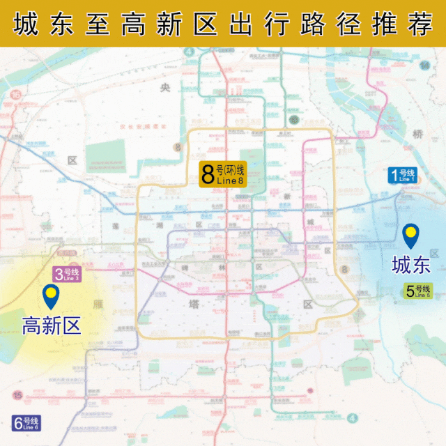 以前由城南方向经2号线北大街站、4号线五路口站换乘至城东、城西方向的市民乘客,现在可选择在2号线电视塔站或4号线曲江池西站换乘8号(环)线前往。