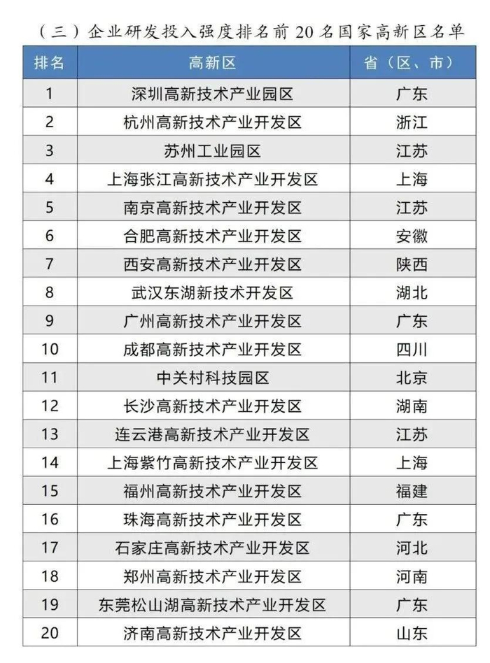 企业研发经费投入强度是衡量一个高新区创新活力的重要指标。在此次评价中,深圳高新技术产业园区、杭州高新技术产业开发区、苏州工业园区等表现出色。