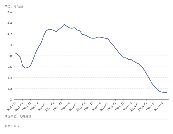 2020年初疫情突发,原奶的生产和收购就出现一定困难。2021年,由于需求恢复等原因,导致了乳企抢奶源现象。然而从2022年开始,新建牧场产能释放,原料奶供应量增加,而中国奶制品消费不及预期。原料奶持续供大于需,原奶价格持续下跌(图4)。