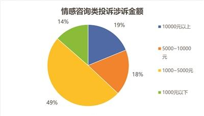 另外,黑猫投诉平台显示,有关情感资讯类的投诉中,涉诉金额大多集中在1000元-5000元,占比达到49%。而在北青报记者暗访的几家情感机构中,一般第一期服务价格都为2999元、2980元、3888元等。