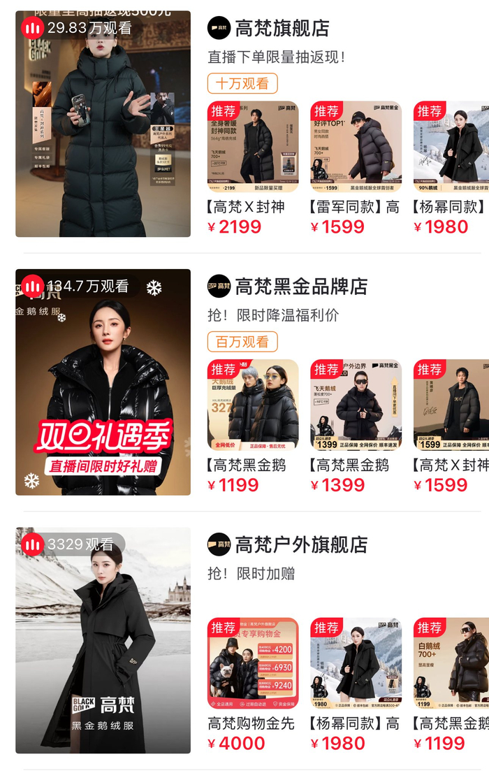 高梵也堪称直播最卖力的羽绒服品牌。据新华财经统计,在淘宝平台,高梵官方旗舰店每天直播时长基本在18小时以上,高梵黑金店从10月底开始更至少9次开启了连续4天4夜的直播。抖音平台同样不例外,官方旗舰店基本每日直播休息时间不超过1小时,远超其他羽绒服品牌时长。