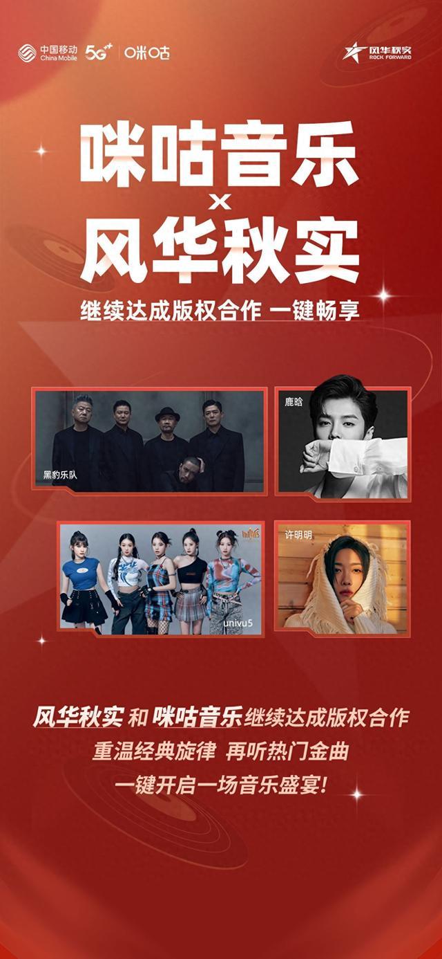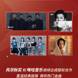 目前,风华秋实旗下歌手、乐队的音乐作品已在咪咕音乐上架。其中包括黑豹乐队、鹿晗、汪峰等经典华语头部艺人曲目,以及许明明、univu5等新声代歌手的新潮音乐。