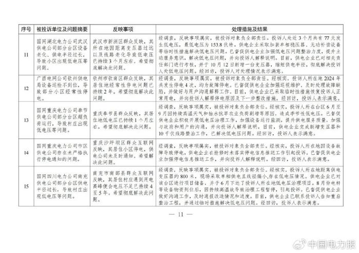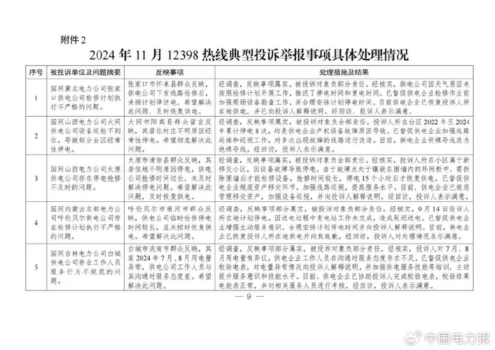 针对群众反映的投诉举报,国家能源局派出机构严格按照有关法规政策规定进行处理。一是督促供电企业进一步规范用电报装管理,强化业扩报装全流程管控,严格按照规定时限完成装表接电;二是要求供电企业加强设备隐患排查整治,强化停电抢修管理,合理规划计划停电,增加抢修资源投入,提升设备管控和停电抢修能力,切实提高供电可靠性;三是通过行政处罚、监管约谈、责令整改等方式,纠正有关企业违法违规行为,维护公平公正的市场秩序和群众合法权益;四是通过解释说明、澄清事实,消除群众误解。(2024年11月12398热线典型投诉举报事项具体处理情况见附件2)
