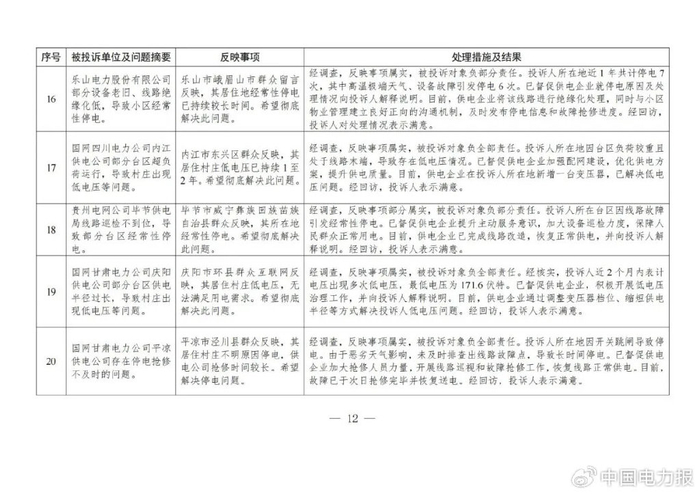 2.停电抢修问题。部分地区设备故障老化、催缴电费不及时,导致用户停电,引发群众投诉。相关投诉举报数量靠前的2个省份为福建(12件)、重庆(12件)。