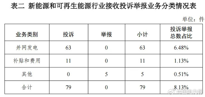 新能源和可再生能源行业排在第二位,数量为79件、占投诉举报总数的8.13%,主要集中在并网发电方面。
