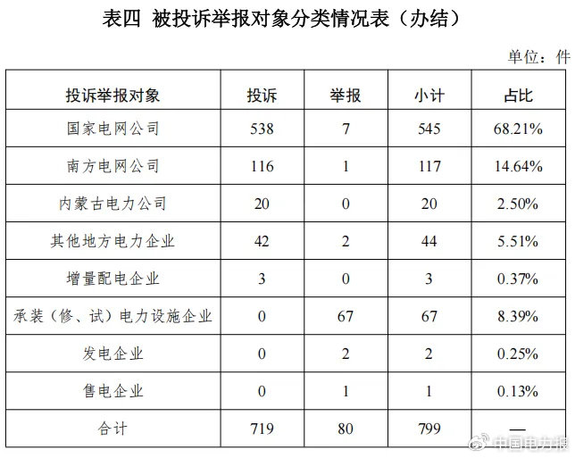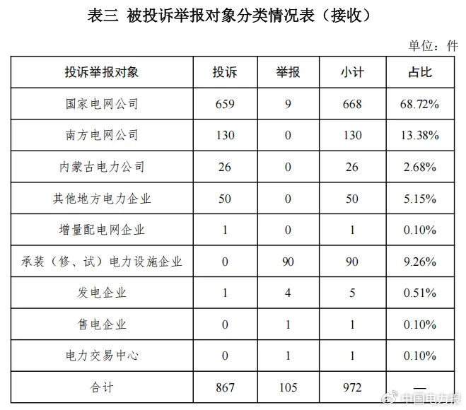 供电企业875件、占投诉举报总数的90.02%,其中国家电网公司668件、占投诉举报总数的68.72%,南方电网公司130件、占投诉举报总数的13.37%,内蒙古电力公司26件、占投诉举报总数的2.67%,其他地方电力企业50件、占投诉举报总数的5.14%,增量配电网企业1件、占投诉举报总数的0.10%;承装(修、试)电力设施企业90件、占投诉举报总数的9.26%;发电企业5件,占投诉举报总数的0.51%;售电企业1件、占投诉举报总数的0.1%;电力交易中心1件、占投诉举报总数的0.1%。