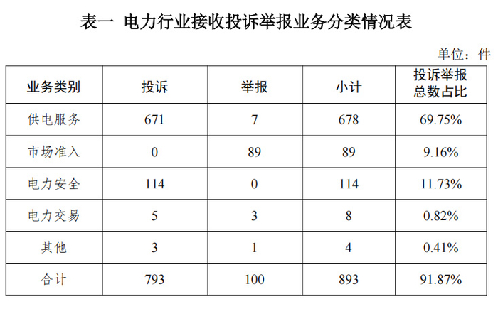 电力行业排在首位,数量为893件、占投诉举报总数的91.87%,主要集中在供电服务、市场准入、电力安全等方面。