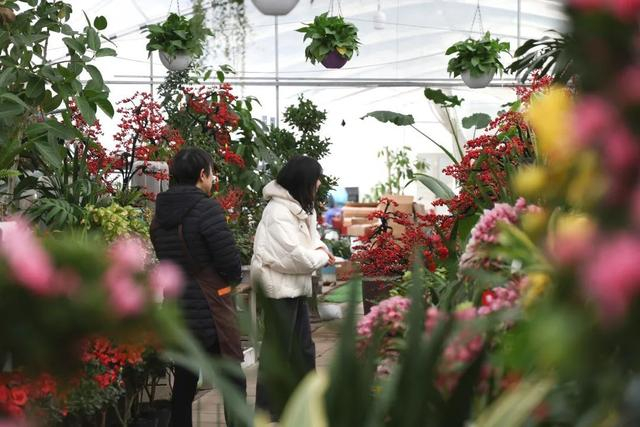 年的脚步越来越近,走进森花基地,不断有货车来来往往,停在店家门口卸货,商家们忙着将一盆盆花搬进暖棚里。进入其中,各种色彩鲜艳的年宵花令人目不暇接,不少市民在摊位前挑选、咨询,一派红红火火迎新春的喜庆氛围。
