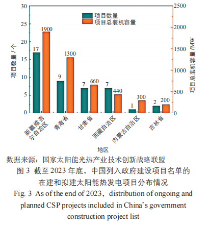 据国家太阳能光热产业技术创新战略联盟统计,截至2023年底,中国列入政府建设项目名单的在建和拟建太阳能热发电项目超过40个,总装机容量约为4800MW,预计这些太阳能热发电项目最晚将于2025年完成建设,项目分布情况如图3所示。截至2024年底,中国并网太阳能热发电的累计装机容量或将达到1700MW。