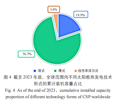 通过对全球(统计范围主要包括西班牙、美国、阿联酋、沙特、科威特、北非、南非、以色列、印度、智利、法国、意大利及中国等国家和地区)不同太阳能热发电技术形式下的累计装机容量进行分析发现,截至2023年底,导热油槽式(下文简称为“槽式”)太阳能热发电累计装机容量的占比约为76.7%,熔盐塔式(下文简称为“塔式”)太阳能热发电累计装机容量的占比约为19.9%,熔盐线性菲涅尔式(下文简称为“线性菲涅尔式”)太阳能热发电累计装机容量的占比约为3.4%,具体如图4所示。由此可知,在全球太阳能热发电市场中,槽式为主要的太阳能热发电技术形式。