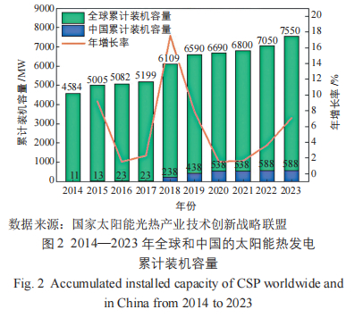 2023年,中国无新增并网太阳能热发电站。截至2023年底,中国太阳能热发电的累计装机容量为588MW,均采用兆瓦级以上太阳能热发电机组;其中,并网型太阳能热发电机组为11个,总装机容量为570MW,单台太阳能热发电机组的最大装机容量为100MW,最小装机容量为10MW。2014—2023年全球和中国的太阳能热发电累计装机容量如图2所示。