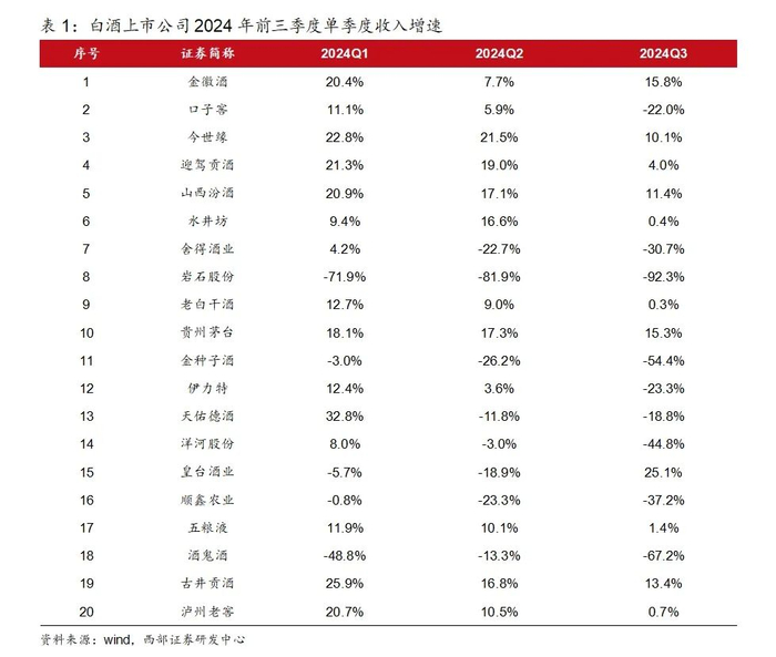 2024年第一季度,20家白酒公司中5家单季度营收负增长,中位数增速是12.1%;第二季度8家公司单季度营收负增长,中位数增速6.8%;第三季度9家公司单季度营收负增长,中位数增速0.3%。收入增速逐季向下态势非常明显。金徽酒、今世缘、山西汾酒、贵州茅台、古井贡酒五家公司在2024年第三季度仍旧保持了双位数以上收入增速,体现出较强抗周期能力。