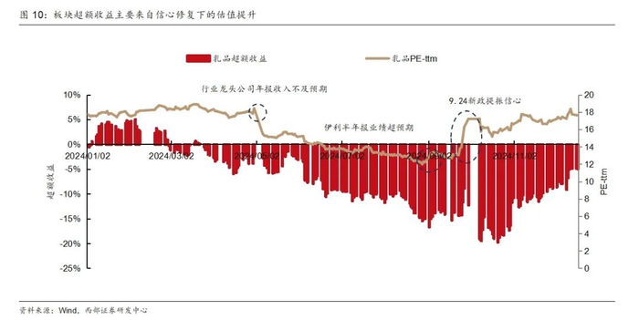 “9.24新政至今”:消费信心修复,板块快速回补接小幅震荡,随后回归温和修复。“9.24新政”的一系列提振消费信心的措施,让市场对消费板块信心显著提升,因此乳品板块随大盘一起快速上涨。10月8日以后,市场情绪逐渐回归理性,经过短期震荡后重新回归温和修复。