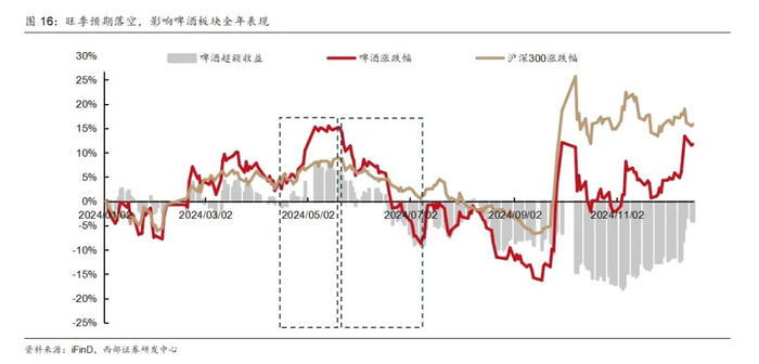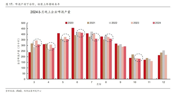 1.低基数效应。24年啤酒产销下滑,一项重要的原因在于夏季多个区域受阴雨天气影响。25年若天气回归正常,对啤酒现饮消费场景没有过多影响,则24年的低基数效应有望带来25年旺季较高的行业产销量增长。