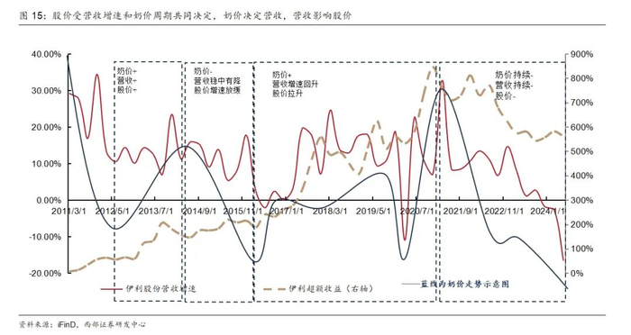 当我们把原奶价格、营收增速、股价综合分析(如下图所示),我们可以看到如下现象:当奶价上行期,行业头部公司的营收增速中枢会有所提升,同期头部公司的超额收益(用伊利股份股价涨跌幅-同期沪深300指数涨跌幅表示)提升;当奶价下行期,头部公司的营收增速放缓甚至回落,股价的超额收益也明显减少。我们可以简述为奶价上行利好乳制品行业。
