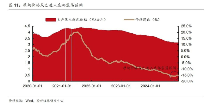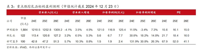 我们认为乳品板块的上游——奶牛养殖环节正在经历一轮出清。奶价有望逐渐企稳:经过一轮较为充分的调整,奶价快速下跌过程已经完成,即将进入奶价筑底阶段。我们判断在2025年行业去化压力仍在,但已经不及2024年惨烈。2024年是原奶价格快速下行的一年,行业不仅面临着消费需求不振的压力,更面临供给端单产提升和存栏增长的双重压力。期间,头部乳企的原奶采收配额制更是加快了社会化牧场的存栏去化进度。展望2025年:需求端压力预计略有改善(受益于24年乳企去库存带来的渠道顺畅发货);供给端荷斯坦奶牛单产提升空间有限,行业亏损下存栏预计不增或微降。因此,去化的压力已经不及2024年惨烈。