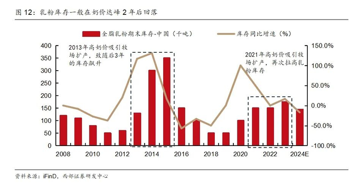 乳粉角度,预计2024年底有望边际缓和:因液奶不易储存的特性,在奶价较低时,乳企通常选择喷粉保存,在奶价高位时喷粉量一般明显减少。因此,乳粉库存的周期与奶价周期存在一定的错峰关系。参考2008年以来两轮乳粉库存周期的规律,2013年奶价达到高位后,吸引行业积极扩产,导致乳粉库存周期在2015年达到高点;2021年奶价达峰后,2023年或为乳粉库存周期的高点,在2024年末乳粉库存压力预计边际缓和,甚至库存量有可能略有减少。