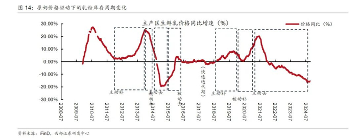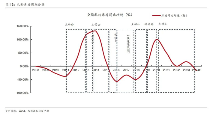 2011年中-2013年中,主动补库存。期间生鲜乳价格企稳并回升,乳品行业的参与者看到供需关系缓解并受价格回暖提振信心,主动增加乳粉库存。