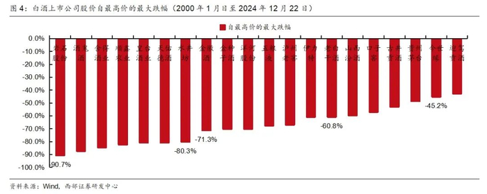 自2000年1月1日至2024年12月22日,20家上市白酒公司在此区间内股价自最高价的最大跌幅统计:跌幅最少的是迎驾贡酒,跌幅为42.7%;跌幅最大的是岩石股份,跌幅90.7%;平均跌幅为68.1%,中位数跌幅为68.9%。