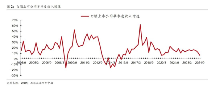 从2002年第三季度到2024年第三季度,白酒上市公司单季度收入增速经历了两次负增长。第一次是2008年第四季度,由于美国次贷危机触发全球金融危机,白酒单季度收入增速从前一季度的+12.6%直线跳水到-16.2%。但是仅经历一个季度负增长后,2009年第一季度收入增速重回增长,达到10.0%。第二次负增长从2013年第二季度开始到2015年第二季度历时9个季度。2024年第三季度收入6.2%的增长是除去两次负增长时期之外,2002年第三季度以来最低的收入增速。按照2024年前面三个季度的趋势发展,不进行外部干预的情况下,白酒上市公司单季度收入增速大概率将迎来第三次负增长。