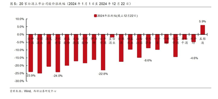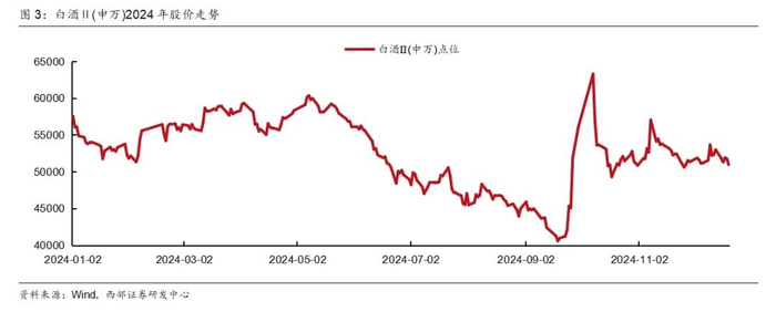 2024年截止12月22日白酒Ⅱ(申万)指数跌幅12.1%,。如果以2024年9月19日的盘中最低点位40574.2点计算,2024年白酒Ⅱ(申万)指数最大跌幅为26.9%。同期上证指数最大跌幅为11.4%,深证成指最大跌幅为19.3%。