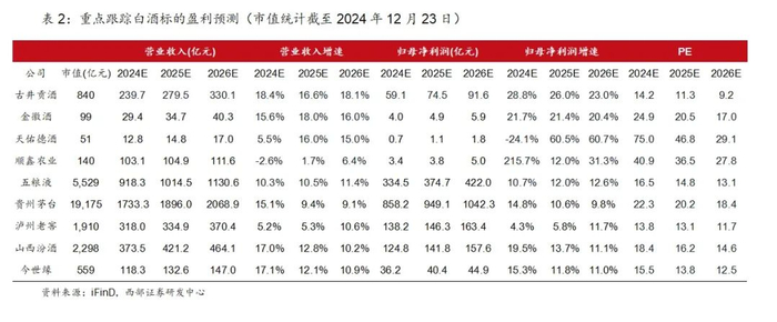 投资建议:白酒:进可攻退可守,建议把握中长期配置时点。本轮白酒板块调整幅度足够大且时间较长,风险释放相对充分,随着今年9月24日及之后政策陆续出台,扭转经济悲观预期,白酒估值已快速完成一轮修复。展望2025年,提振内需为政策首要任务,更多刺激消费政策有望陆续出台,政策预期、切实提高分红将构建板块估值底部。此外,头部酒企营收降速共识已达成,报表将加速出清,供给预期改善下行业系统性风险降低,供需有望逐步平衡,待政策效果显现经济逐步修复,行业需求重回上行通道,板块有望迎来戴维斯双击。标的方面,确定性推荐茅台、五粮液、汾酒、古井、今世缘,建议关注迎驾,弹性推荐泸州老窖,关注泛全国化次高端酒企报表出清程度和基本面改善拐点。大众品:乳品板块处于原奶价格磨底的关键时期,在25H1低奶价时期推荐新乳业、妙可蓝多等中小乳企,并持续跟踪牧场存栏、终端需求变化等,推荐择机布局伊利股份等龙头乳企。啤酒板块建议在旺季前关注低基数下的投资机会。