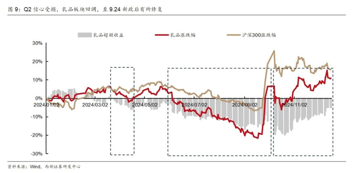 5月底-“9.24新政前”:业绩+奶价双重担忧,致板块触底。在此阶段乳品板块持续回调,且明显跑输同期的沪深300指数,背后的原因有二:1.板块龙头公司2季度因去库存导致业绩低于预期,市场对此定价,并因此担忧3季度业绩;2.上游原奶价格持续低位,市场担心其对行业竞争格局、乳企存货及信用减值的影响。板块在9月中旬达到信心低点。