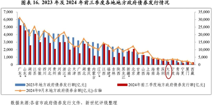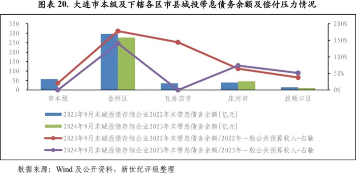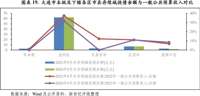 以存续城投债余额与一般公共预算收入规模相对比,大连市3个区县2024年9月末存续城投债余额与2023年一般公共预算收入的比率均小于35.0%,金州区、庄河市和旅顺口区该比率分别为31.7%、10.9%和8.3%,城投债负担较轻。
