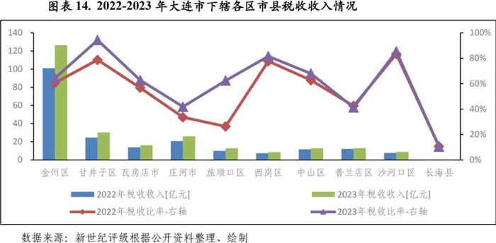 从一般公共预算收入构成看,大连市市辖区质量普遍较优,市县质量相对较弱。2023年,甘井子区、沙河口区和西岗区税收比率分别为94.3%、85.4%和81.6%,质量优;中山区、金州区、瓦房店市和旅顺口区税收比率在60.0%-70.0%,质量相对较好;其余区市县均在50%以下,质量较差,其中以第一产业为主的长海县仅为10.5%,列全市各区市县末位;旅顺口区受大额捐赠收入影响上年税收比率较低及当年税收增加影响,税收比率较上年上升36.1个百分点至62.4%;甘井子区受当年税收收入同比大幅增长23.0%和非税收入大幅下降72.5%影响,税收比率较上年上升15.6个百分点;普兰店区受罚没收入增加导致非税收入增幅较大影响,税收比率较上年下降1.2个百分点;长海县主要受非税收入增幅较大影响,税收比率较上年下降0.2个百分点。