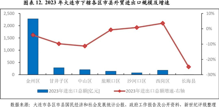 大连市产业资源、人口等主要集聚于区域面积较大的区市县,各区市县经济发展水平差异明显。2023年,大连市下辖各区市县经济均实现增长,增速区间在4.3%-7.5%,金州区最高,庄河市最低,7个区市县增速高于全国及全省水平,各区市县经济总量排名与上年一致。大连经济技术开发区和保税区所在地的金州区地区生产总值达3000亿元,显著领先于其余各区市县;制造业较发达的瓦房店市和甘井子区地区生产总值超千亿元,经济总量排名第二、三位;以金融业、商业等服务业为主的中山区地区生产总值超900亿元,经济总量排名第四;以第一产业为主的长海县现阶段经济发展水平显著落后于其它区县,经济体量小,地区生产总值百亿出头。从需求端看,2023年大连市各区市县固定资产投资主要集中于地区生产总值排名前三的金州区、瓦房店市和甘井子区,各区市县增减参半,且差异较大;各区市县消费市场持续恢复,消费集中于人口较多的金州区和甘井子区,以及大连市商业中心中山区,各区市县消费增速区间在7.5%-10.1%,增速均较高;可获得公开数据的7个区市县外贸进出口仅西岗区和沙河口区有所增加,其余均有所下降,降幅区间在0.7%-24.9%,长海县降幅最大,旅顺口区最小;金州区外贸进出口规模最大,达 2280亿元,占比超全市的50%,同比下降4.1%;其余区市县均不超过300亿元。2024年上半年度,可获得公开数据的6个区市县经济均实现增长,增速在区间2.5%-7.6%,长海县最低,瓦房店市最高。