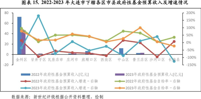 从增速看,2023年,大连市下辖4个区市政府性基金预算收入正增长,6个区市县负增长。其中,甘井子区、沙河口区、普兰店区和庄河市正增长,增速区间大,为6.9%-180.1%,庄河市最小,甘井子区最高,甘井子区主要系上年基数很小,当年增加了国有土地使用权出让收入0.8亿元所致;其余区市县均同比下降,区间在-25.0%至-125.6%,西岗区下降最小,长海县下降最多,长海县主要系受退返以前年度土地出让金收入影响;政府性基金预算收入规模最大的金州区同比下降35.4%。