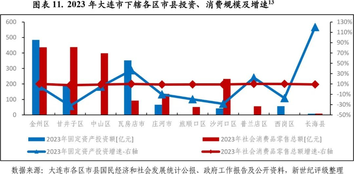 [13] 2023年中山区、普兰店区和旅顺口区固定资产投资数据未获得;西岗区社会消费品零售总额数据未获得,金州区固定资产投资和社会消费品零售总额数据均为金普新区数据,下同。