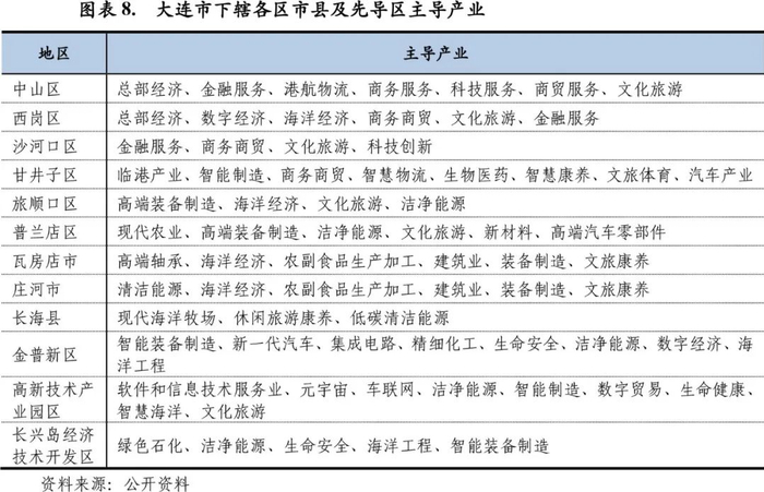 根据大连市总体产业布局,结合各区域的资源禀赋,大连市下辖各区市县及先导区重点发展如下产业。