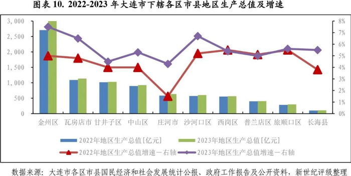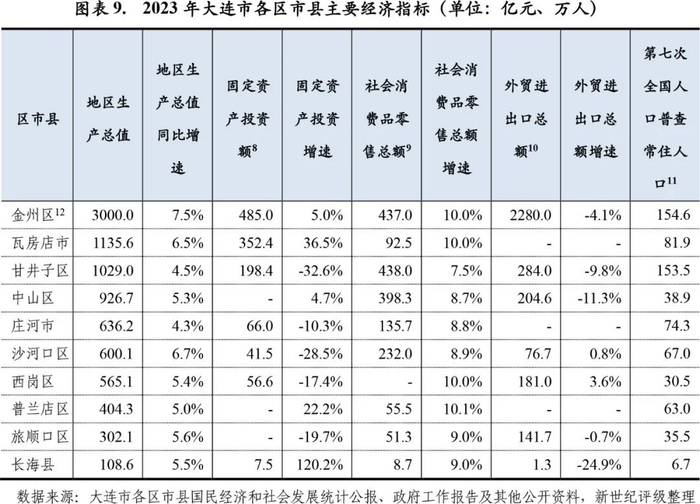 [11] 公开资料未获得2023年末大连市各区县常住人口数据,本报告采用第七次人口普查数据。金州区常住人口为金普新区数据,瓦房店市不含长兴岛经济区数据。