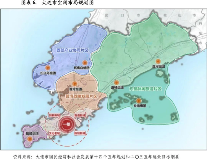 空间总体布局上,大连市综合考虑人口分布、经济布局、土地利用、生态环境保护等因素,坚持“强湾聚心、廊道生长”空间发展策略,以建设大连湾国际化高端功能集聚区为目标,以哈大、高新—旅顺南路、甘井子—旅顺北路、开发区—庄河四条主廊道为骨架,以快速交通串联城市四大板块,实现城市核心功能从大连湾向外拓展,构建“一核四城、四片七组团”的城镇空间发展格局。“一核”为城市核心区;“四城”为文化老城、创新新城、枢纽新城、智造新城;“四片”即旅顺历史文化片区、普湾战略发展片区、西部产业协同片区、东部休闲旅游片区;“七组团”包括旅顺组团、普湾组团、瓦房店组团、长兴岛组团、皮杨组团、庄河组团、长海组团。各地区按照城镇空间布局要求,结合本地实际,实施差异化功能定位。