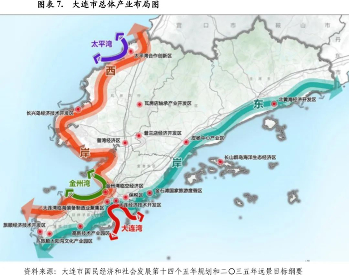 总体产业布局上,大连市围绕黄海和渤海沿岸打造“两岸三湾多园区”的产业空间格局。黄海沿岸(东岸)重点发展新能源、新材料、海洋经济、纺织服装、食品加工、旅游休闲等特色产业,渤海沿岸(西岸)重点发展绿色石化、高端轴承、电力装备等先进制造业,增强黄海渤海两岸协同能力。围绕大连湾建设国际活力湾区、金州湾打造东北亚空港商务区、太平湾构建东北亚“新蛇口”的功能定位,强化“三湾”示范引领功能,带动其他湾区“一湾一策”联动发展,推动浪漫海湾名城建设。推动“多园区”集群发展,依托现有产业园区和重点集聚区,落实各园区主导产业和功能定位,培育和发展规模经济,支撑主导产业形成竞争新优势。