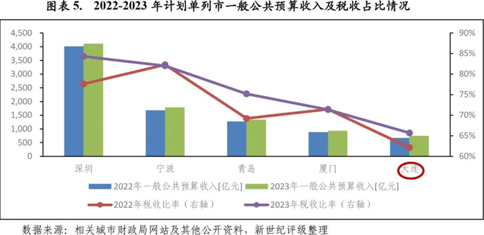 大连市一般公共预算收入以税收收入为主,但近三年全市税收收入占一般公共预算收入的比重低于70%。2023年大连市税收收入为492.7亿元,较上年增长18.4%,主要系受经济回升及上年实施大规模减税退费拉低基数影响;税收比率为65.7%,较上年上升3.5个百分点,税收比率排名在5个计划单列市中仍垫底。2023年大连市全市税收收入主要以增值税、企业所得税、契税、城市维护建设税、房产税、个人所得税和城镇土地使用税为主,上述七项税种合计实现税收收入452.1亿元,占税收收入的比重为91.7%,其中增值税实现233.0亿元,占税收收入的47.3%,占比较上年上升12.4个百分点,是税收收入的最主要构成;企业所得税实现75.2亿元,占税收收入的15.3%,是仅次于增值税的重要构成,其余税种占比均小于10%。2023年大连市一般公共预算支出为1013.5亿元,同比增长2.3%,其中一般公共服务、公共安全、教育、社会保障和就业以及卫生健康的支出合计555.8亿元,同比下降1.0%,占一般公共预算支出的54.8%,较上年下降1.8个百分点。从市本级看,2023年大连市本级税收收入为237.2亿元,同比大幅增长23.2%,税收比率为70.5%,较上年上升1.1%,税收来源基本与全市一致;市本级一般公共预算支出为488.9亿元,同比增长4.0%。当年大连市一般公共预算自给率[6]为74.0%,较上年上升6.4个百分点;市本级一般公共预算自给率为68.8%,较上年上升9.8个百分点,大连市一般公共预算自给程度总体一般。