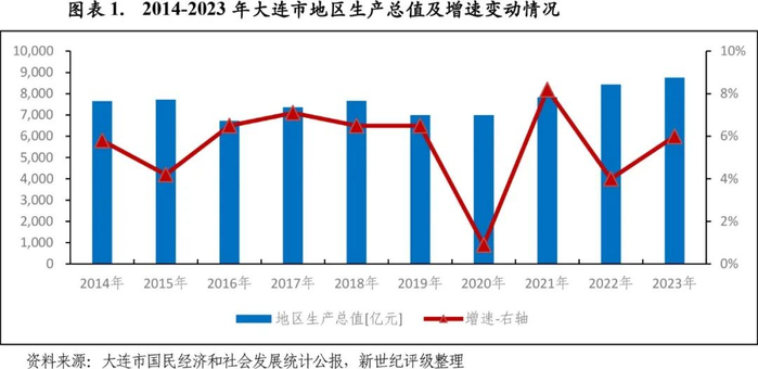 大连市是我国计划单列市、东北地区最重要的港口城市,以及国家重要的石油化工、装备制造基地,近年高技术制造业发展较快。2023年,大连市经济平稳向好,大幅增长的工业支撑作用明显,经济增速高于全国和全省水平,地区生产总值列计划单列市第四位,经济增速与深圳市并列首位。当年,大连市实现地区生产总值8752.9亿元,同比增长6.0%;经济增速分别高于全国、全省0.8个和0.7个百分点。2023年,大连市工业生产加快回升,高技术制造业增长较快。当年,全市规模以上工业增加值同比增长12.0%,增速较上年提高6.9个百分点,高于全国7.4个百分点,其中规上高技术制造业增加值同比增长30.3%,增速较上年提升14.9个百分点,高于全市规上工业18.3个百分点。从需求端来看,2023年,大连市投资增长乏力,消费由上年的小幅下降转为较大幅增长,进出口由上年的大幅增长转为小幅下降,固定资产投资、社会消费品零售总额和进出口总额同比分别增长0.6%、增长8.8%和下降5.0%。2024年前三季度,大连市经济平稳增长,实现地区生产总值6643.2亿元,同比增长5.0%,增速分别高于全国、全省0.2个和0.1个百分点;固定资产投资、社会消费品零售总额和进出口总额同比分别增长2.0%、增长3.2%和下降3.5%,进出口总额降幅收窄。