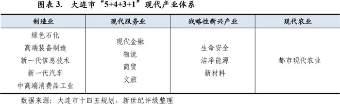 大连市是国家重要的石油化工、装备制造基地,在石化、大型船舶、内燃和电力机车、机床、轴承、核电、汽车音响、互感器、化工新材料等行业都有全国行业领先企业。同时,大连市也是全国第一批10个国家软件产业基地之一,6个国家软件出口基地之一,第一个服务外包基地城市,第一个软件知识产权保护示范城市,获得软件产业国际化示范城市、软件人才国际培训基地和创新型软件产业集群等荣誉称号。近年来,大连市持续优化产业结构和经济结构,聚焦制造业、现代服务业、战性新兴产业和都市型现代农业的主导产业,加快构建“5+4+3+1”现代产业体系。